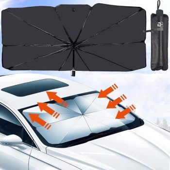 چتر آفتابگیر ماشین مدل umbrella یک انتخاب هوشمندانه برای محافظت از داشبورد وفضای داخلی خودرو در برابر تابش مستقیم آفتاب و گرمای شدید است. این آفتابگیر با طراحی مشابه چتر معمولی به راحتی باز و بسته میشود و در کمتر از چند ثانیه فضای داخلی خودرو را در برابر نور خورشید، اشعه ی فرابنفش ( uv ) و دمای باال ایزوله میکند.